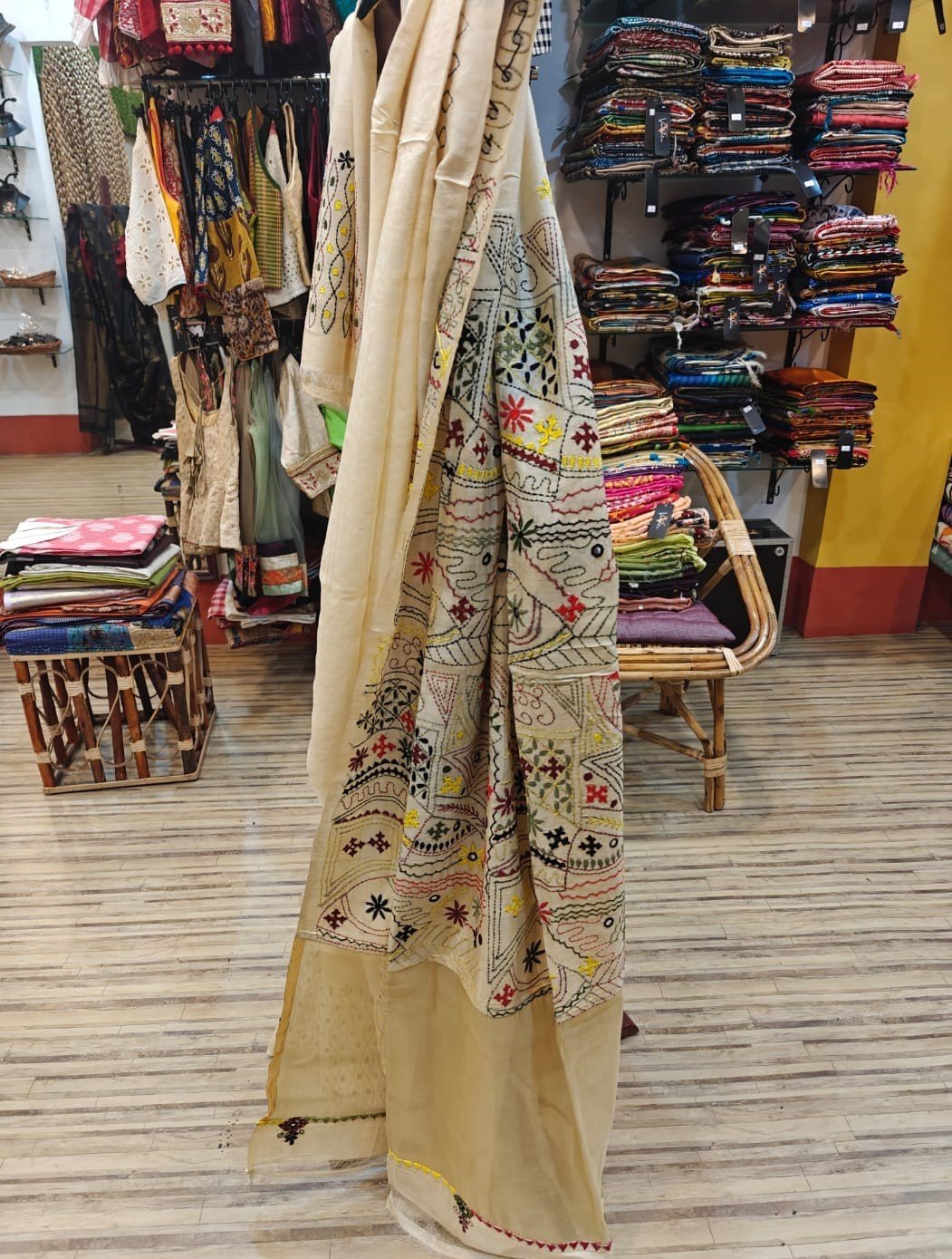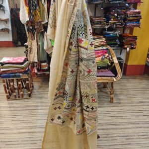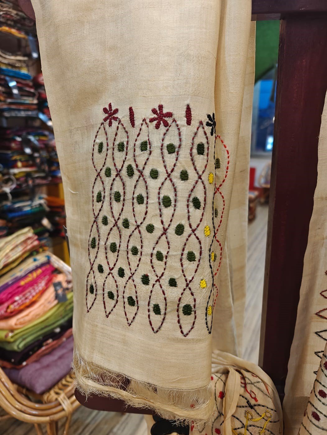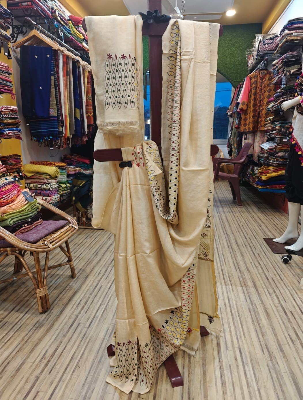 This elegant Pure Tussar Silk Saree is decorated with a fusion of hand embroidery styles, giving it depth, detail, and a handcrafted charm. Ideal for those who admire Indian needlework and rich silk textiles.