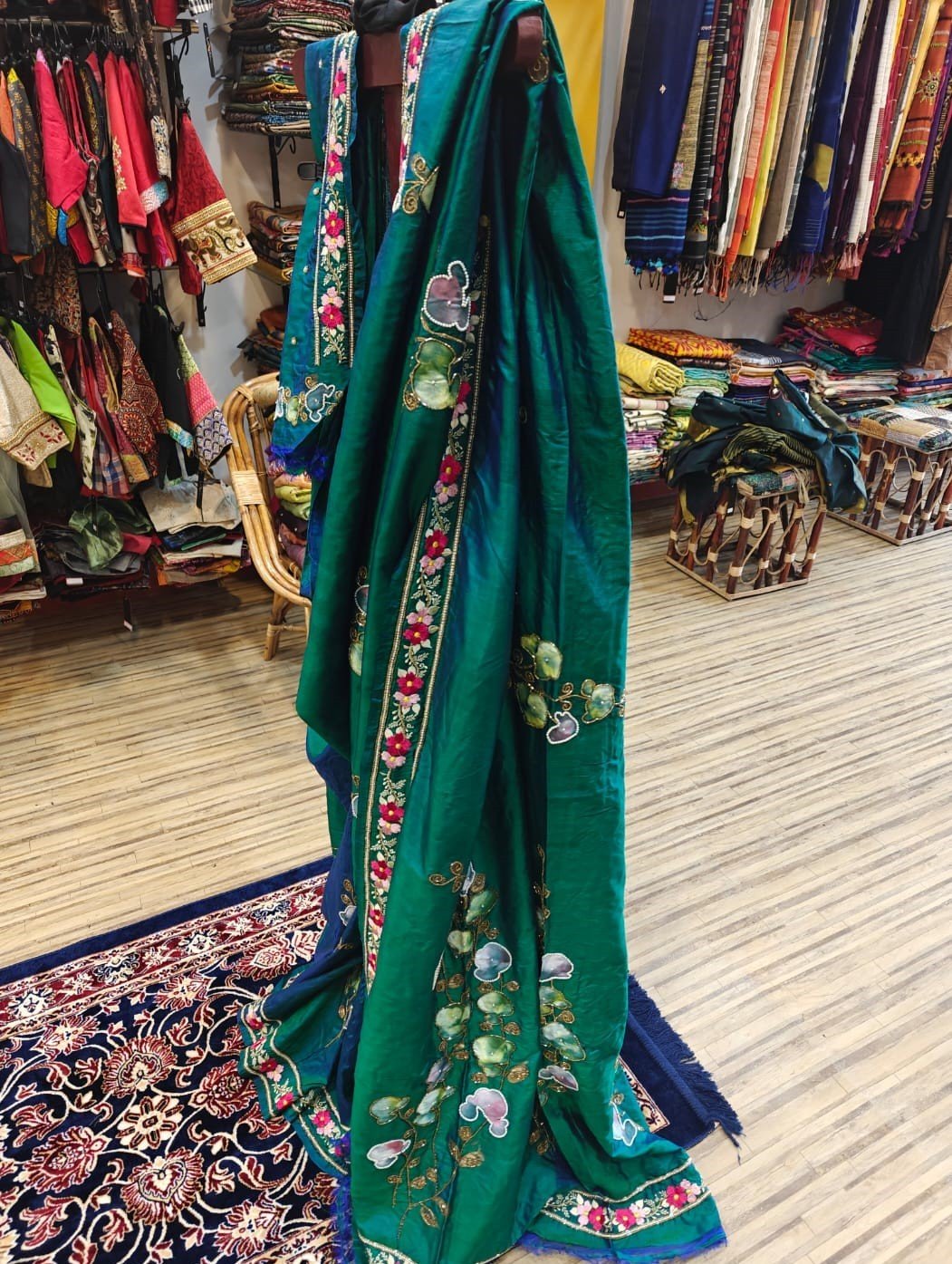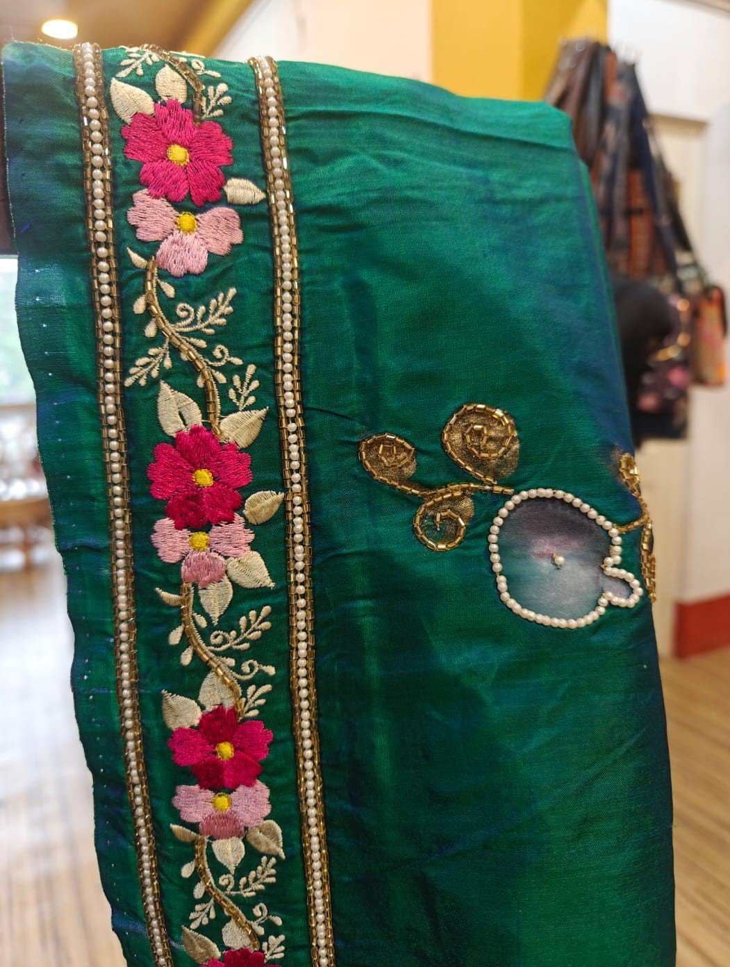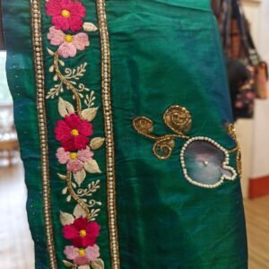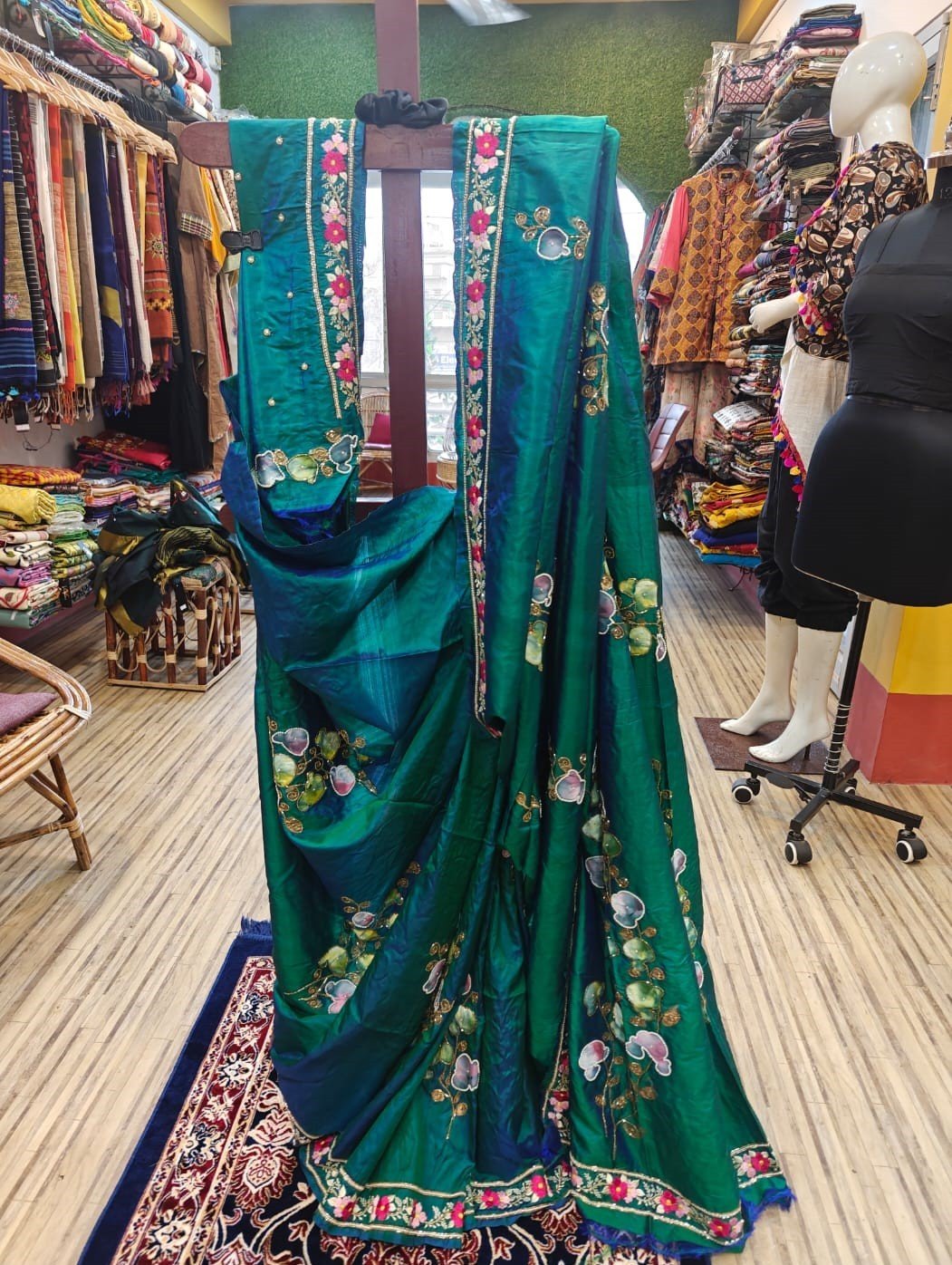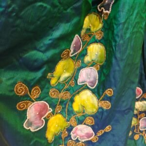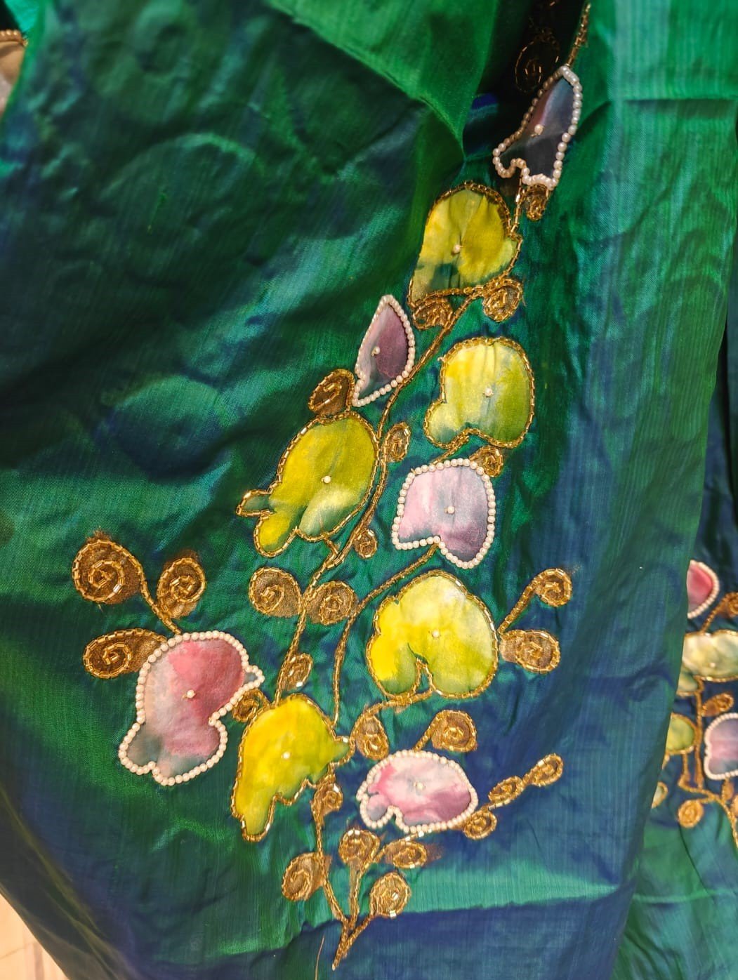 This saree is a celebration of artistic grandeur. Crafted on premium Bishnupur Katan Silk, it features a rich fusion of hand painting, hand cut dana work, and machine embroidery. The result is a visually stunning, texturally rich piece made for weddings, receptions, or exclusive events.