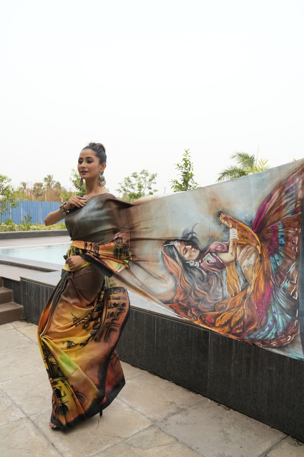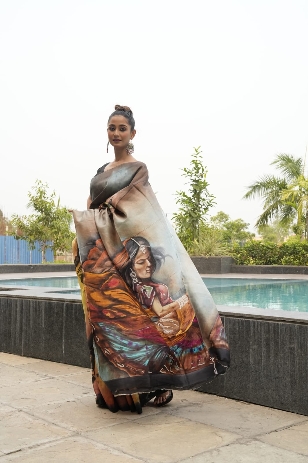 Celebrate the soul of Indian tradition with this Hand-Painted Bishnupur Katan Silk Saree, showcasing exquisite Rajasthani folk dance art. Crafted on lustrous Bishnupur Katan silk, this saree features acid hand painting that brings culture to life with every brushstroke.