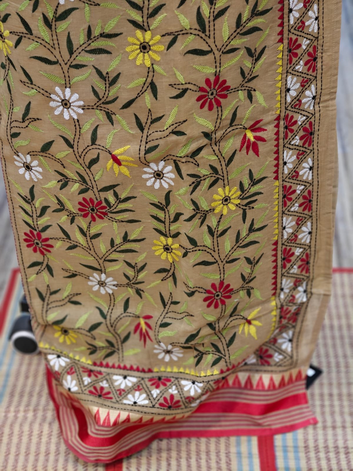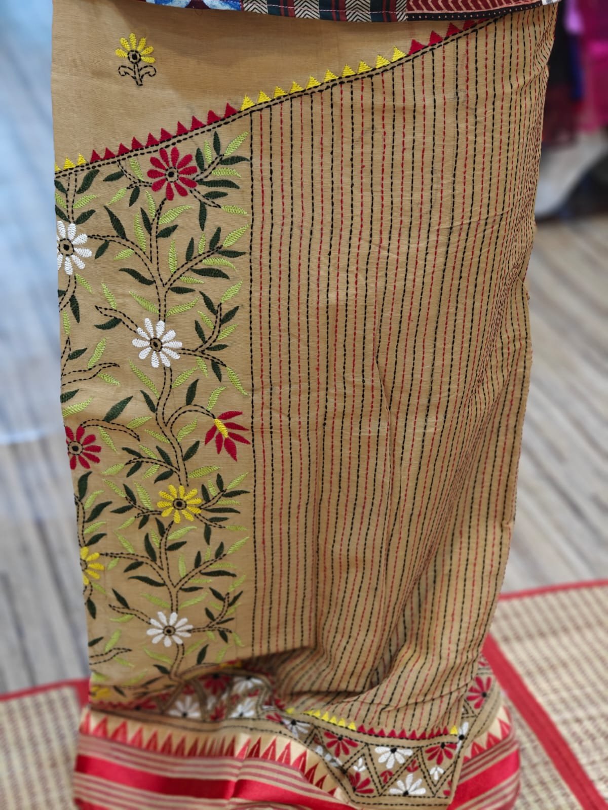 Embroidery: Intricate hand-done Kantha work that showcases traditional craftsmanship