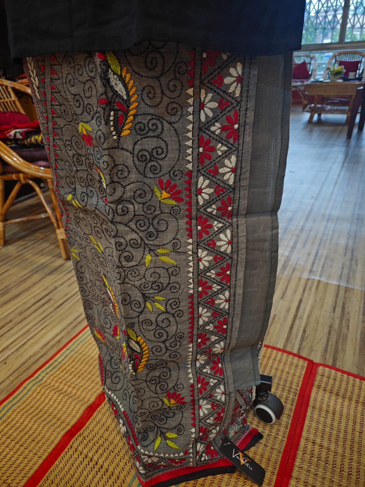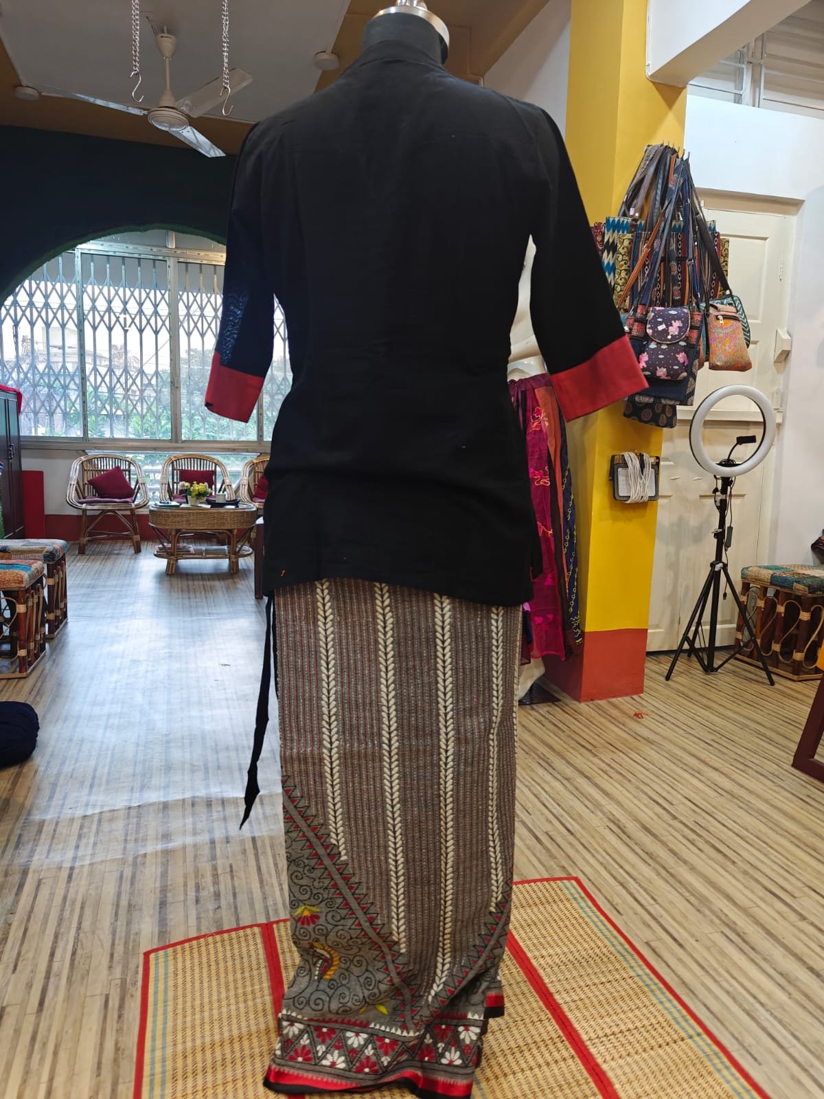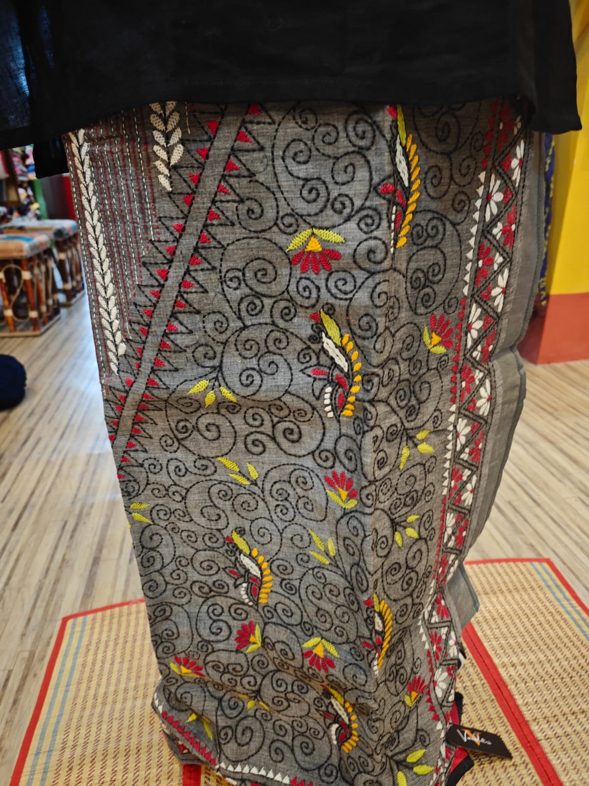 Make a statement with this sophisticated hand Kantha embroidered wrap-around skirt, featuring a unique asymmetrical design that blends tradition with contemporary style.