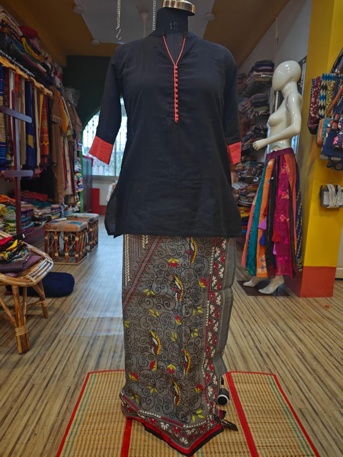 Design: Intricate hand-done Kantha embroidery with a stylish asymmetrical cut