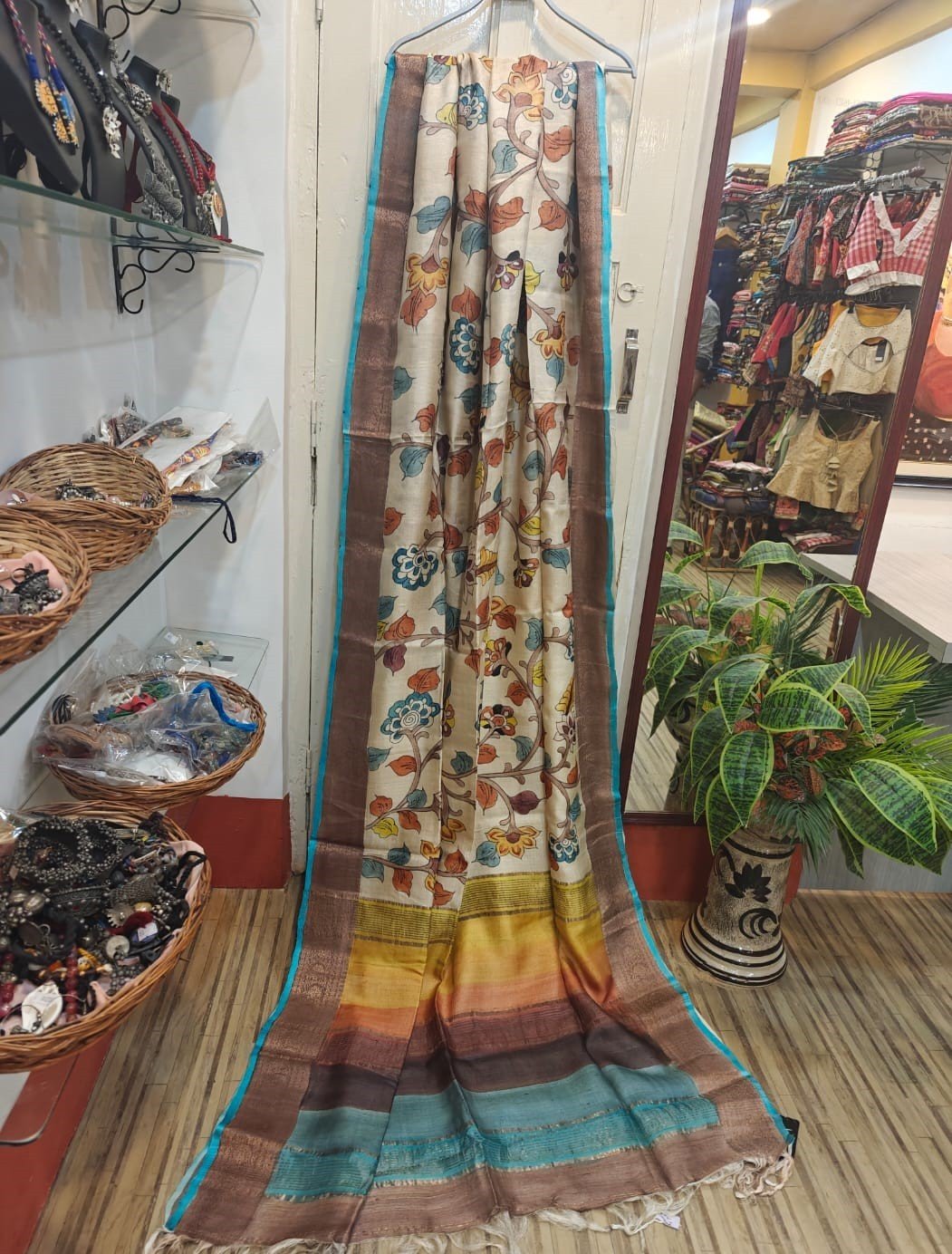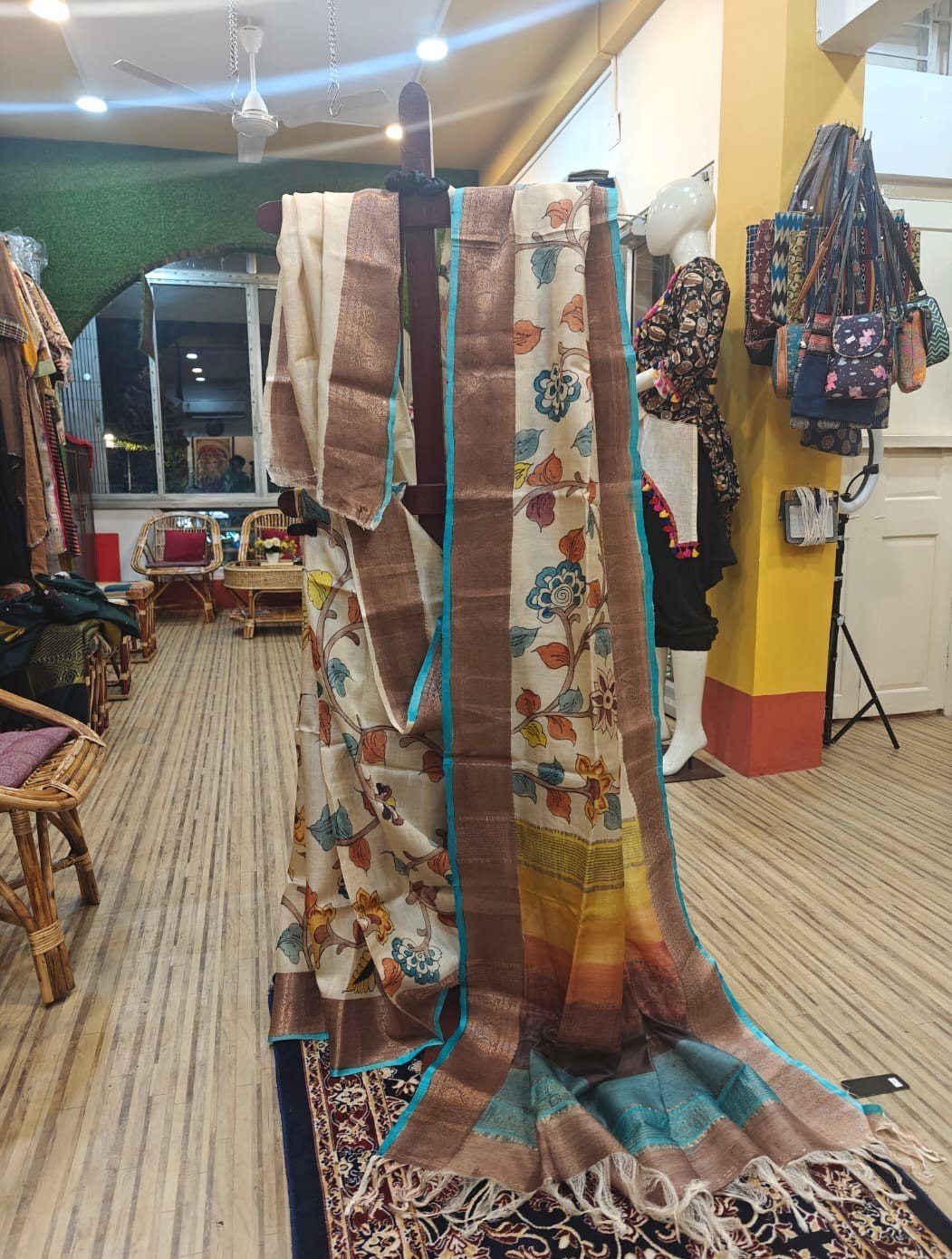 Elevate your ethnic wardrobe with this Hand-Painted Zari Tussar Silk Saree, featuring Kalamkari-style artwork crafted using acid hand painting techniques. The luxurious Zari Tussar fabric brings a soft golden glow, perfectly complementing the intricate hand-painted designs.